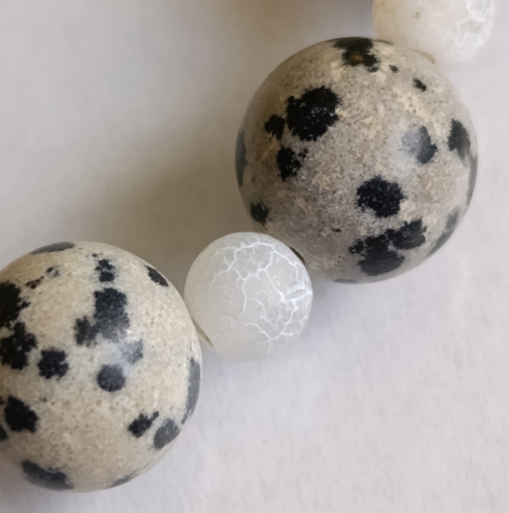 Náramek z korálků jaspisu, s bílými korálky achátu, s malými černými perličkami. Jaspis je ochranný kámen, přináší klid, oporu a pomoc ve stresu. Minerál je vhodný pro znamení Beran, Panna, Váhy a Vodnář. Korálky jsou průměru 8 a 10 mm, obvod náramku cca 18 cm.